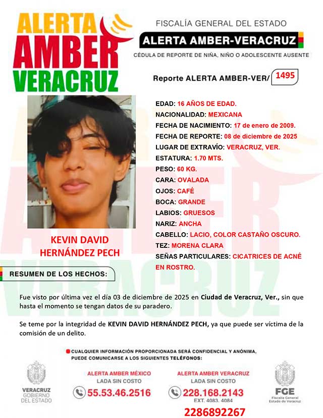El programa Alerta Amber Veracruz, agradece su colaboración e informa la activación de la ALERTA AMBER- VERACRUZ 1495 por el adolescente Kevin David Hernández Pech de 16 años de edad