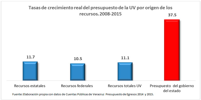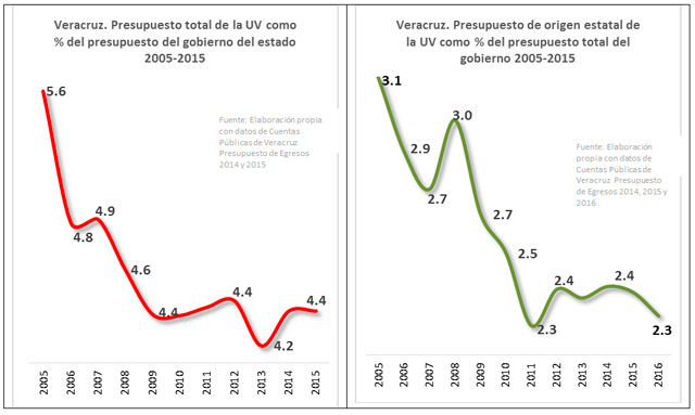 Este comportamiento ha provocado una reducción de la participación del presupuesto universitario en el total estatal, de modo que mientras en 2005 los recursos totales (federales y estatales) destinados a la UV representaban el 5.6% del total en 2015 ya sólo representan el 4.4%. Asimismo, mientras que en 2005 el recurso estatal representaba el 3.1%, en 2015 sólo representa el 2.4% y en 2016 es de apenas 2.3%.