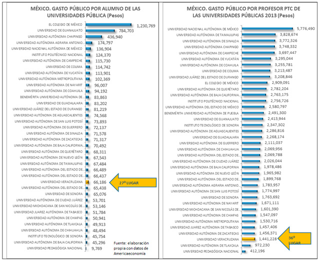 Aún más, al analizar la disponibilidad de gasto por docente y por profesores de tiempo completo (PTC´s) es notorio que su presupuesto es muy pequeño en comparación con el resto de las universidades públicas, pues su gasto promedio por docente es de 697,554 pesos anuales, lo cual la coloca en el 23º, lejos de los 3.3 mdp que invierte la Autónoma de Chapingo, 2.9 mdp del Colegio de México y 1.7 mdp de la Autónoma de Yucatán. Asimismo cabe observar que el gasto promedio por PTC de la UV es de un millón 441 mil pesos anuales, colocándose en el lugar 36º entre las universidades que menos recursos destinan para este grupo de profesores, lejos de los 5.7 mdp que destina la UNAM para el mismo propósito, los 3.8 mdp de la U. Autónoma de Tamaulipas y los 3.7 mdp de la Autónoma de Sinaloa.