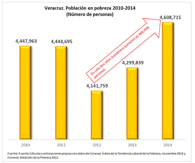 La pobreza crece en Veracruz como consecuencia lógica del derrumbe económico y de la quiebra técnica de las finanzas públicas del gobierno estatal. En los últimos dos años, el número de personas en pobreza aumentó en 466,946, es decir, un 6% de la población total del estado se convirtió en pobre. Esto es resultado de una peligrosa tendencia al alza que indica incrementos cada vez mayores año con año, pues mientras que en 2013 el aumento fue de 158,080 pobres, en 2014 fue de 308,876, lo que sumado da el saldo bianual antes mencionado.