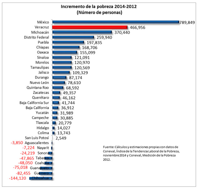 Este resultado ubica a Veracruz en el 2º lugar entre los estados que más pobreza han generado en el período de análisis mencionado, muy lejos de los buenos resultados de Chihuahua que redujo la pobreza en 144,120 personas, Guerrero que logró hacerla descender en 82,455 y Guanajuato en 75,018 personas.