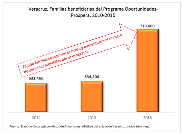 Como resultado de este brutal incremento del número de pobres, Veracruz ocupa en 2015 el primer lugar entre los estados que tiene el mayor número de familias pobres atendidas con el programa Prospera, más de 700 mil familias según lo informó ufano y orgulloso el gobernador de Veracruz Javier Duarte (http://www.alcalorpolitico.com/informacion/veracruz-primer-lugar-nacional-de-beneficiarios-de-prospera-registra-mas-de-700-mil-duarte-160894.html). Aunque la cifra es más bien para provocar mucha vergüenza y preocupación porque corrobora que efectivamente la pobreza está incrementándose en el estado de Veracruz.