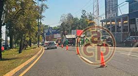 Xalapa, Ver., 27 de febrero de 2026.- Camión de una cervecera provocó el cierre de la avenida Miguel Alemán cerca del mediodía de este viernes al jalar cables de luz. |