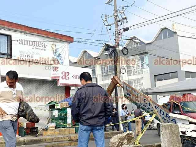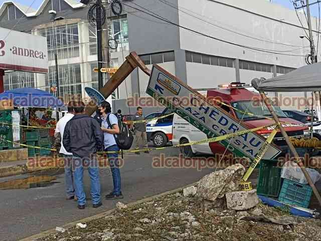 Xalapa, Ver., 16 de marzo de 2023.- Señalamiento vial cayó en la calle Teotihuacán esquina con la avenida Chedraui Caram. Según testigos, el tren jaló un cable y éste a su vez el letrero. PC Municipal acordonó el lugar y se suspendió la circulación.