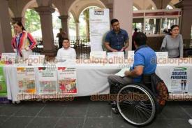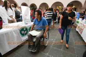 Xalapa, Ver., 27 de septiembre de 2023.- En el Palacio Municipal, la secretaria del Trabajo, Dorheny García; la síndica Cecilia Coronel y las regidoras Helen Sarmiento y Martha Domínguez inauguraron la Primera Feria Municipal del Empleo. Destacó una persona en silla de ruedas buscando una oportunidad laboral.