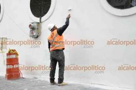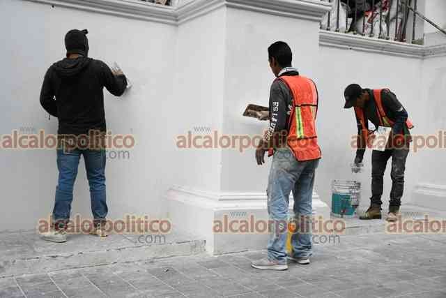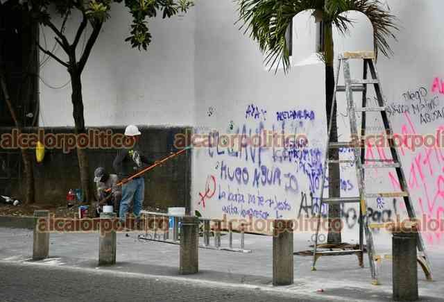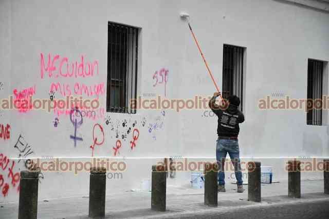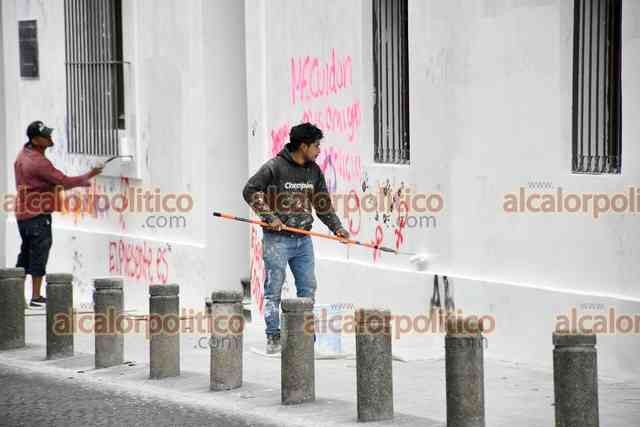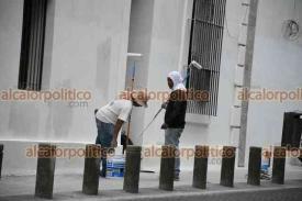 Xalapa, Ver., 9 de marzo de 2025.- Trabajadores pintan de blanco nuevamente el Palacio de Gobierno, luego de las consignas escritas durante la marcha del 8M.