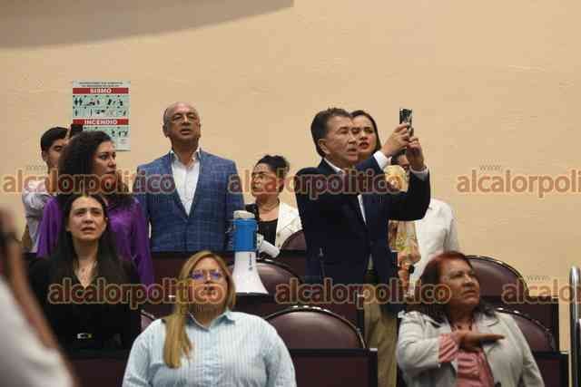 Xalapa, Ver., 14 de marzo de 2025.- Pese a la polémica, la diputada Tanya Carola Viveros volvió a alzar el puño durante el himno nacional, sin embargo, en esta ocasión sus compañeros no lo hicieron, pero fue apoyada por dos personas del público.