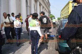 Xalapa, Ver., 24 de abril de 2025.- Auto se quedó sin una llanta frente al Palacio de Gobierno. Lo que complicó la circulación por varios minutos. Agentes de Tránsito agilizaron el tráfico y auxiliaron al conductor.
