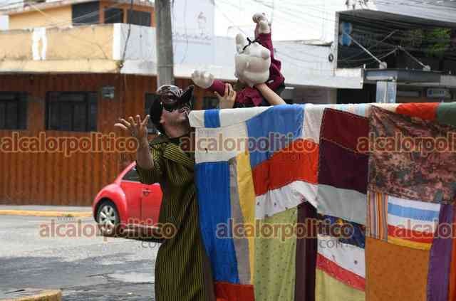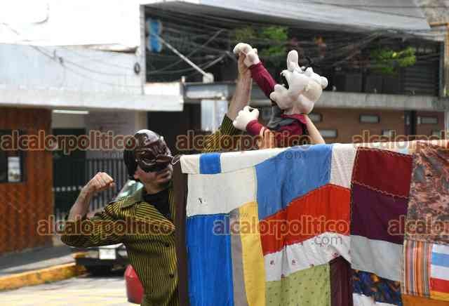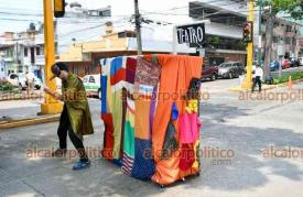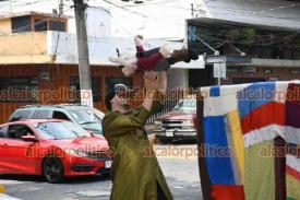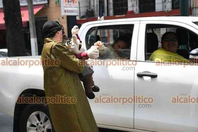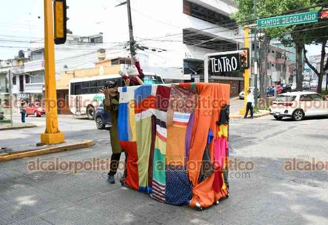 Xalapa, Ver., 25 de abril de 2025.- Con un “carro de comedias” como escenario móvil, Cristina Vázquez y Vladimir Arzate ofrecen pequeñas intervenciones teatrales cada vez que la luz roja del semáforo aparece.