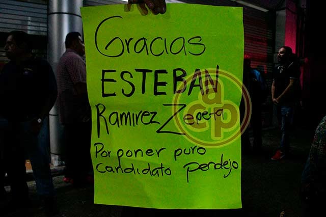 Xalapa, Ver., 6 de junio de 2025.- Simpatizantes de Movimiento Ciudadano, procedentes de diversos municipios, que exhiben pancartas con frases agresivas, se manifestaron esta noche de viernes frente a las bodegas del OPLE, en la calle Clavijero, cerca de la calle Isauro Acosta.