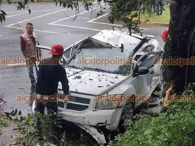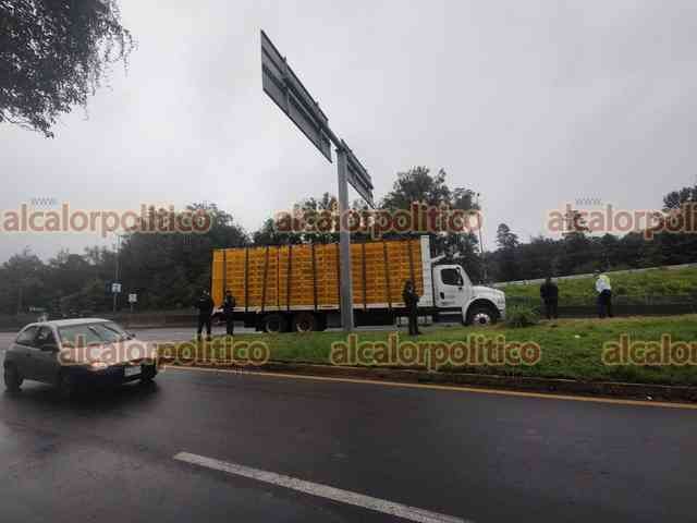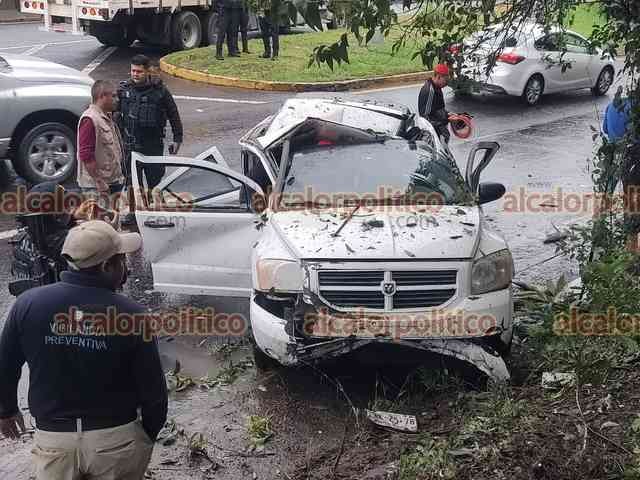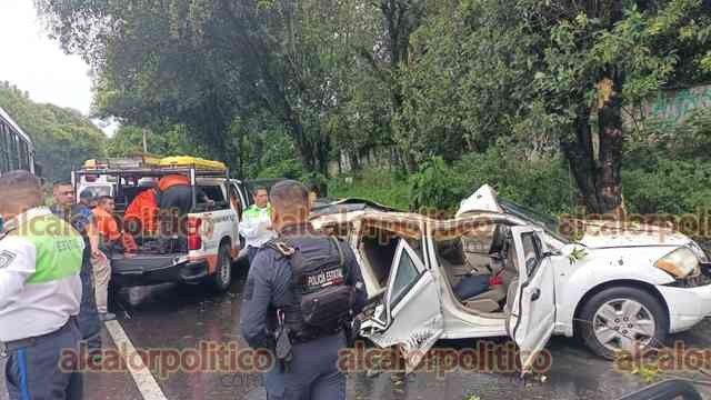 Banderilla, Ver., 16 de junio de 2025.- En la carretera Banderilla-Xalapa, camión de carga le pegó a automóvil, el cual quedó destrozado tras volcar. Tres personas que habían quedado prensadas fueron llevadas de urgencia a un hospital.