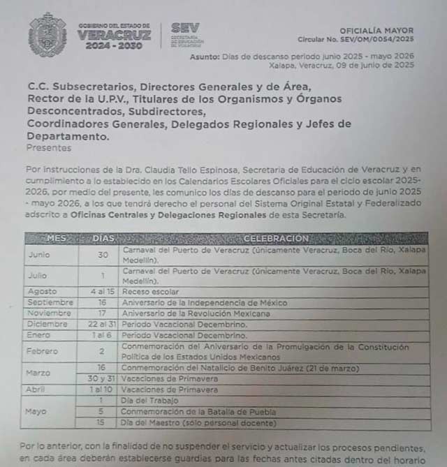 Xalapa, Ver., 17 de junio de 2025.- Aunque el calendario de descansos de la SEV para junio 2025-mayo 2026 (imagen izq.) se incluía a Xalapa por la celebración del Carnaval de Veracruz, un oficio emitido por la dependencia este martes aclara que sólo Veracruz, Boca del Río y Medellín de Bravo tendrán de asueto este 30 y primero de julio.