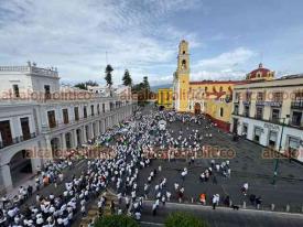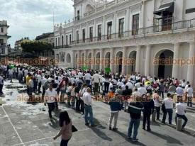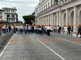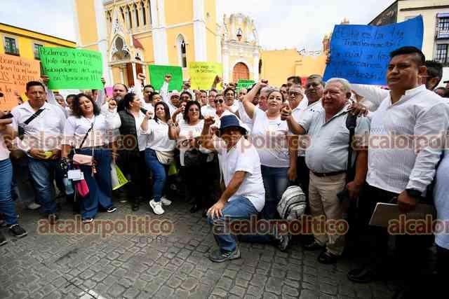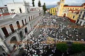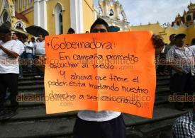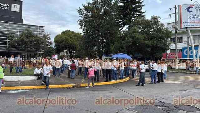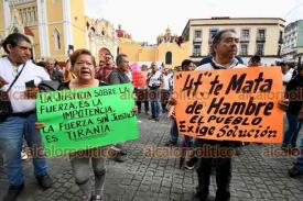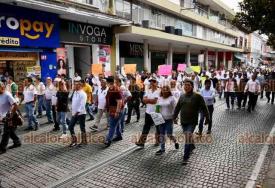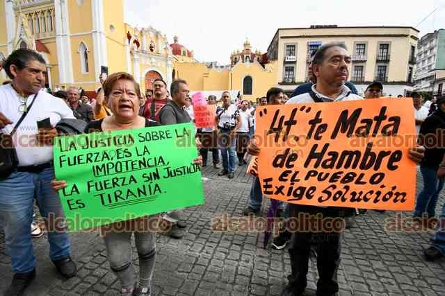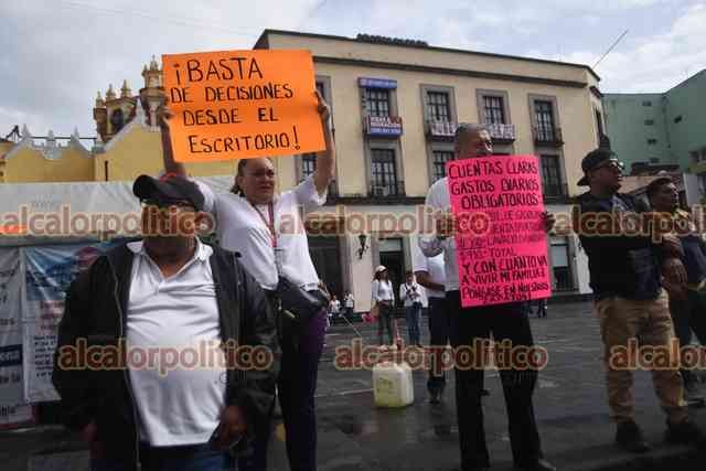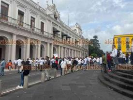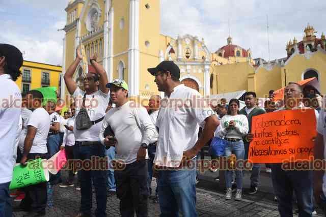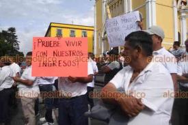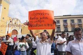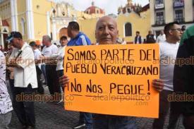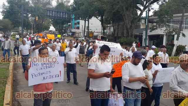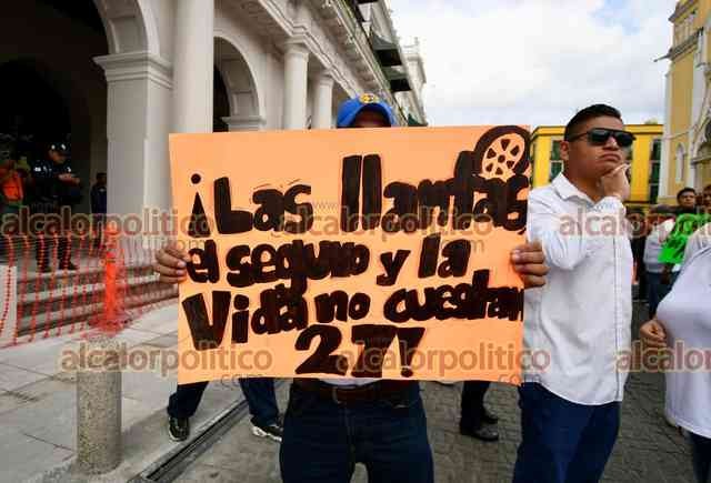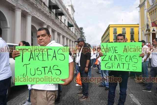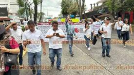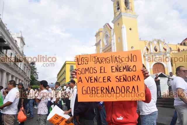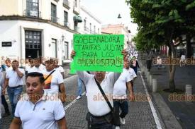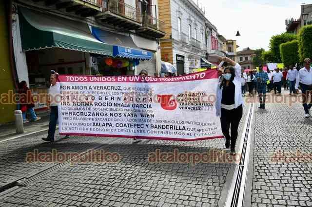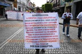Xalapa, Ver., 28 de julio de 2025.- Taxistas marchan del Teatro del Estado a Plaza Lerdo. Otro grupo de choferes tiene cerrada parcialmente la calle Enríquez, en la zona centro. Protestan contra tarifas oficiales.
