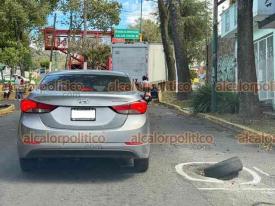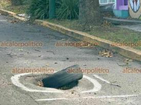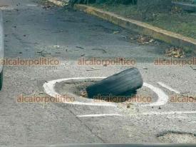 Xalapa, Ver., 30 de octubre de 2025.- Con una llanta y con marcas con pintura advierten a los automovilistas que circulan por la calle Lucio Blanco, colonia Obrero Campesina, que hay un bache en esta zona.