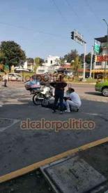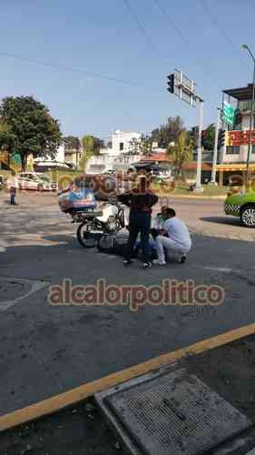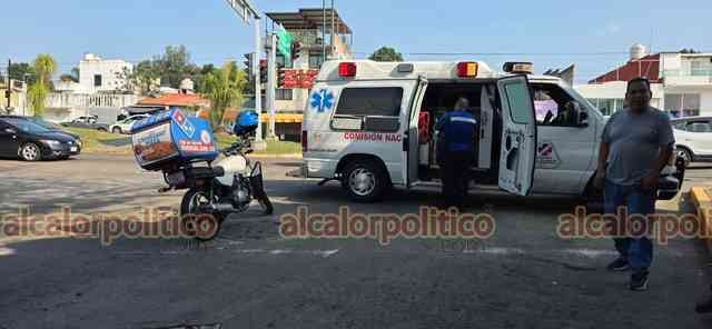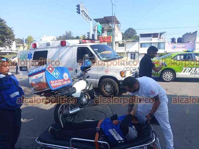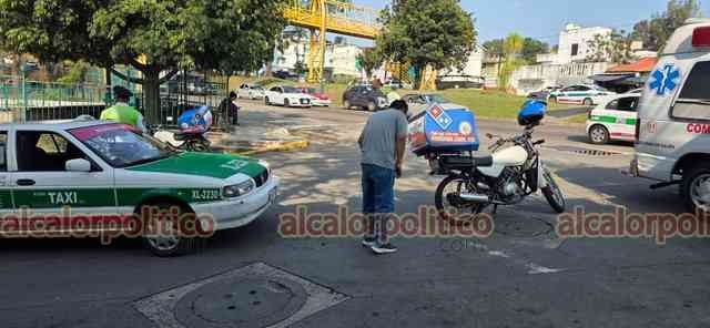 Xalapa, Ver., 3 de diciembre de 2025.- Taxi y una mujer repartidora de pizzas que iba en moto chocaron en la avenida Maestros Veracruzanos, esquina con Adalberto Tejada, en el fraccionamiento Pomona. Paramédicos atendieron a la lesionada, mientras que personal de Tránsito del Estado hizo el peritaje.