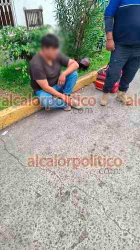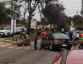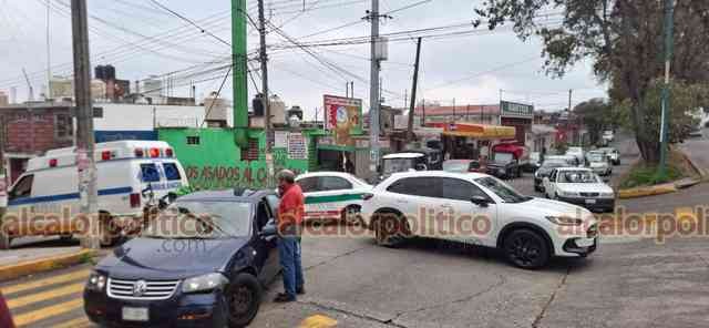 Xalapa, Ver., 7 de diciembre de 2025.- La tarde de este domingo, en la intersección de Pípila y Cerdán, chocaron un auto y una motocicleta. Elementos de Tránsito del Estado tomaron conocimiento de los hechos.
