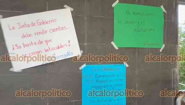 Xalapa, Ver., 15 de diciembre de 2025.- Este lunes, afuera de la sala donde se lleva a cabo el Consejo Universitario General de la UV un grupo de académicos y alumnos se manifestó en contra de la prórroga otorgada a Martín Aguilar.