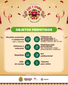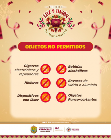 Xalapa, Ver., 19 de diciembre de 2025.- La Secretaría de Seguridad Pública dio a conocer a quienes asistirán al desfile navideño “Luz y Unión: Por Amor a Veracruz” la lista de los objetos permitidos y prohibidos.