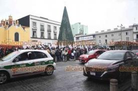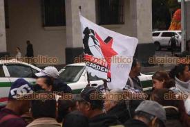 Xalapa, Ver., 22 de diciembre de 2025.- Cardenistas llegaron en autobuses a la plaza Lerdo para demandar al Gobierno del Estado la regularización de predios, entre otras exigencias.