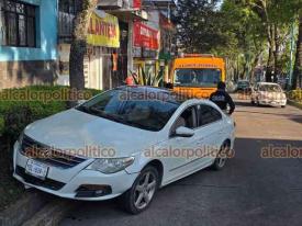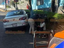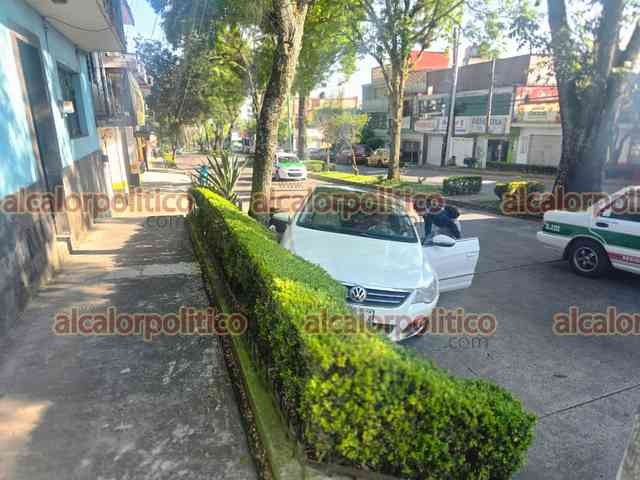 Xalapa, Ver., 2 de enero de 2026. Conductora perdió el control de su auto en la intersección de avenida Américas y Paricutín y terminó sobre una jardinera. Paramédicos de la Policía Municipal atendieron a la mujer por algunos golpes que sufrió.