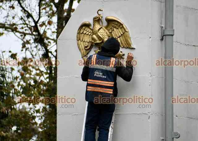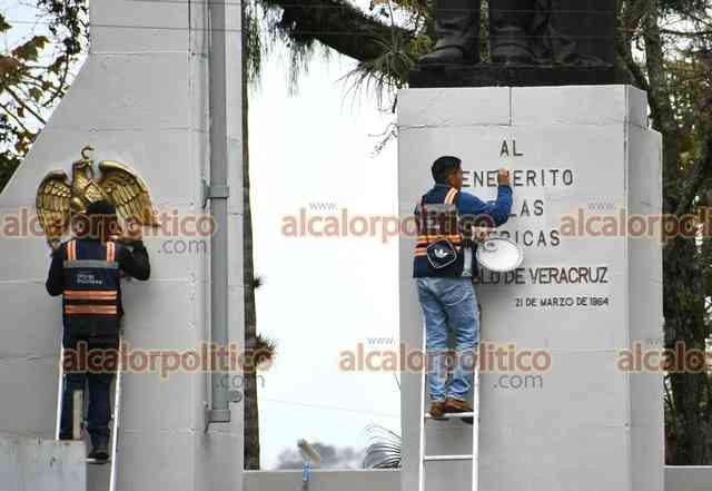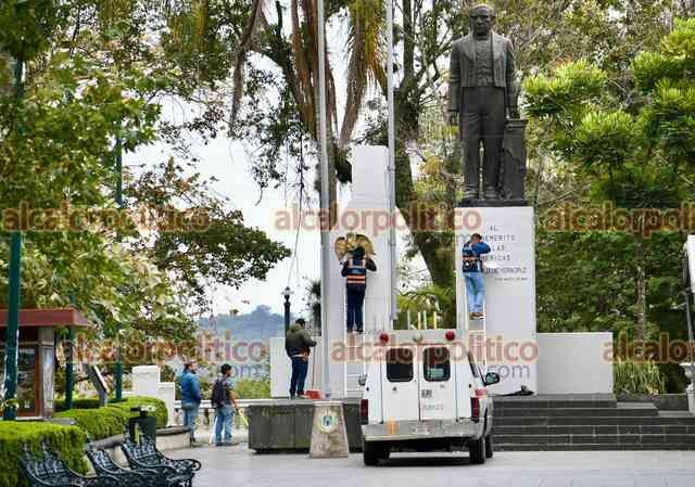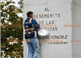 Xalapa, Ver., 11 de enero de 2026.- Le dan una “manita de gato” al monumento de Benito Juárez, ubicado en el Parque Juárez.