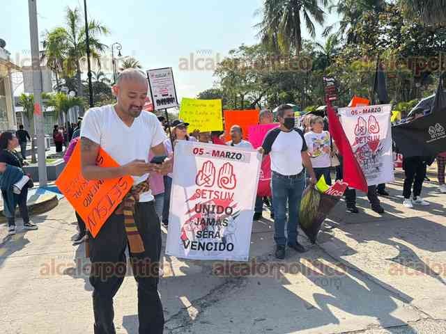 Veracruz, Ver., 4 de febrero de 2026.- Trabajadores del SETSUV marcharon por calles del Centro Histórico. Salieron del Tranvía del Recuerdo hacia el Zócalo.