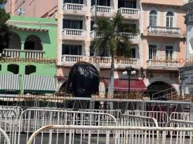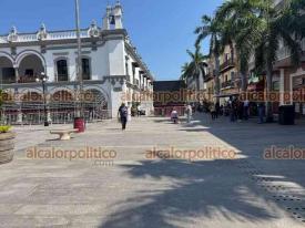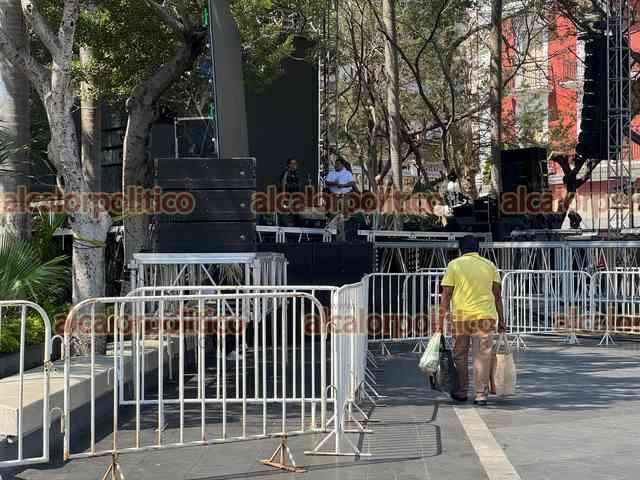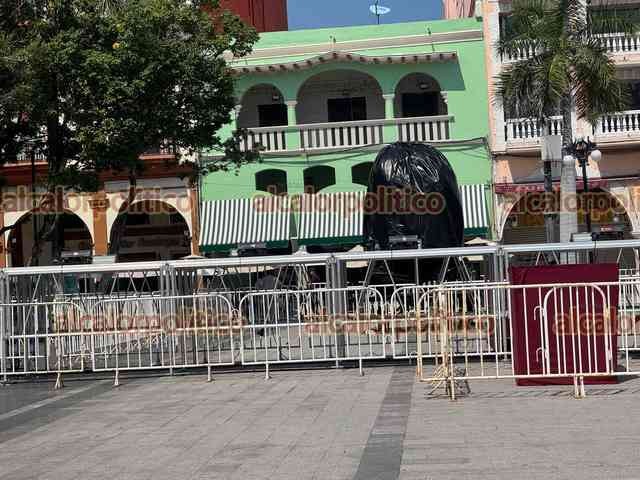 Veracruz, Ver., 10 de febrero de 2026.- Así luce el Zócalo previo a la Quema del Mal Humor este martes a las 20:00 horas, donde la figura a quemar será el “bache”. Hay gradas para los asistentes y pantallas.