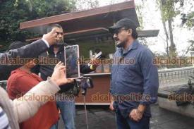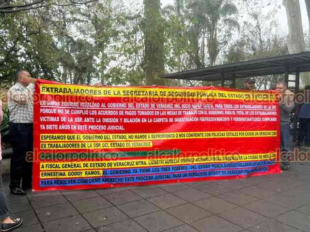 Xalapa, Ver., 16 de febrero de 2026.- Extrabajadores de la SSP protestan frente a Palacio de Gobierno. Acusan que los acuerdos para los pagos no se cumplieron y señalan que la carpeta se perdió tras las inundaciones de Poza Rica.