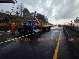 Tlacolulan, Ver., 6 de marzo de 2026.- En la carretera Perote-Xalapa se registró un choque múltiple a la altura de El Fresno, luego que una grúa perdió el control e impactó a 4 vehículos: Se habla de 8 lesionados.