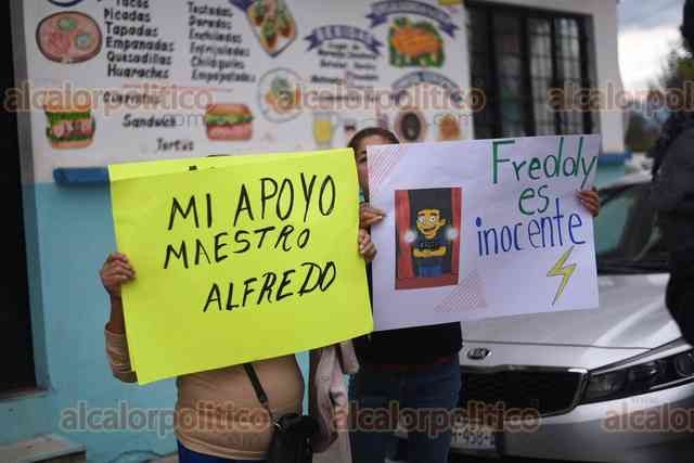 Coatepec, Ver., 12 de marzo de 2026.- Familiares, conocidos, exalumnos, madres y padres de familia se manifestaron afuera de los juzgados de Pacho Viejo para expresar su respaldo al profesor de artes plásticas Alfredo “N”, detenido por el delito de pederastia agravada.