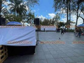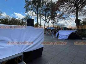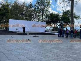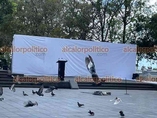 Xalapa, Ver., 20 de marzo de 2026.- En el parque Juárez se alista el escenario para la conmemoración del 220 aniversario del natalicio de Benito Juárez.