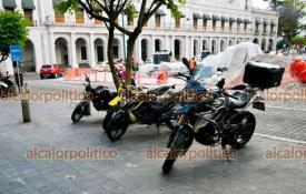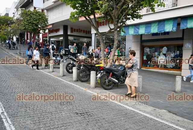 Xalapa, Ver., 20 de marzo de 2026.- Motociclistas usan de estacionamiento las banquetas de calles del Centro.