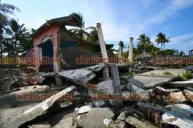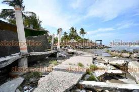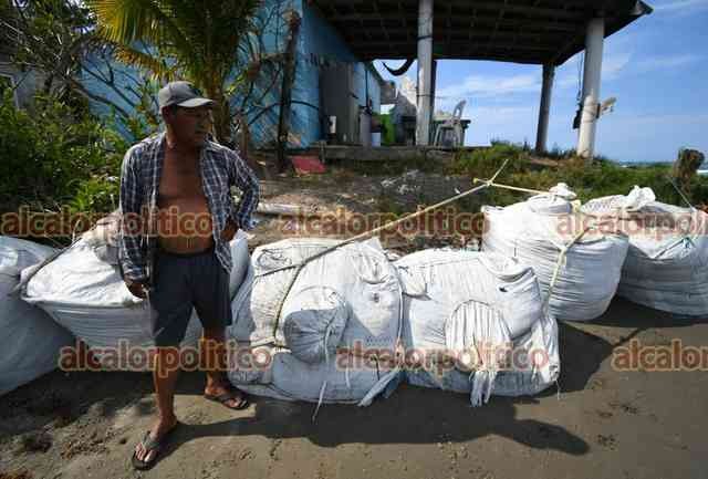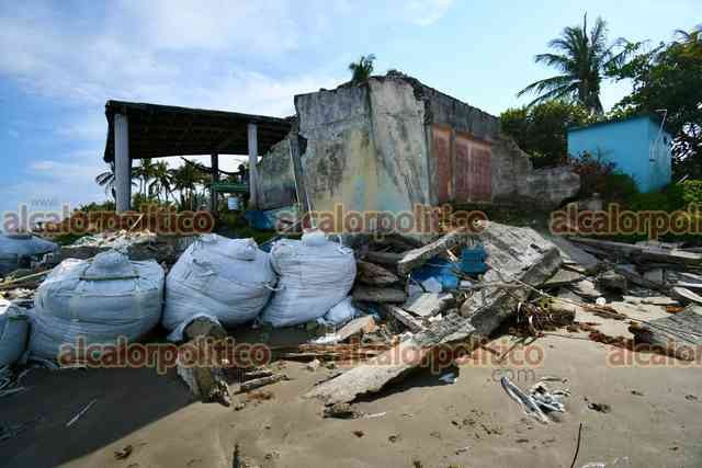 Alvarado, Ver., 15 de abril de 2026.- En Las Barrancas, intentos por contener la erosión han resultado insuficientes. Costales, llantas y otros materiales no han logrado frenar la fuerza de las olas. Más de 20 casas han sido derribadas dejando a diversas familias sin patrimonio.