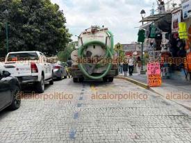Xalapa, Ver., 22 de abril de 2026.- Permanece cerrada la calle Lucio, a partir de Abasolo, hasta antes de Altamirano. CMAS atiende la fuga de un drenaje.