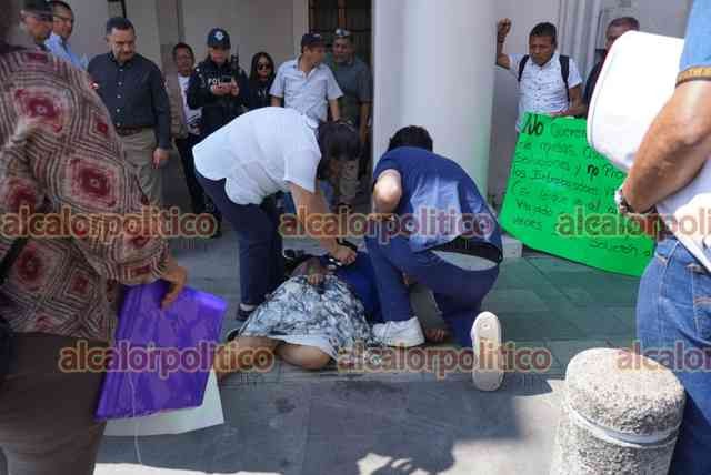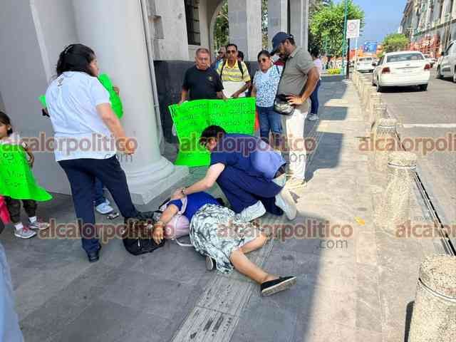 Xalapa, Ver., 28 de abril de 2026.- Una de las personas que se manifestaban bloqueando la calle Enríquez se desmayó, por lo que fue auxiliada por paramédicos frente al Palacio de Gobierno.