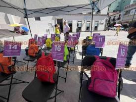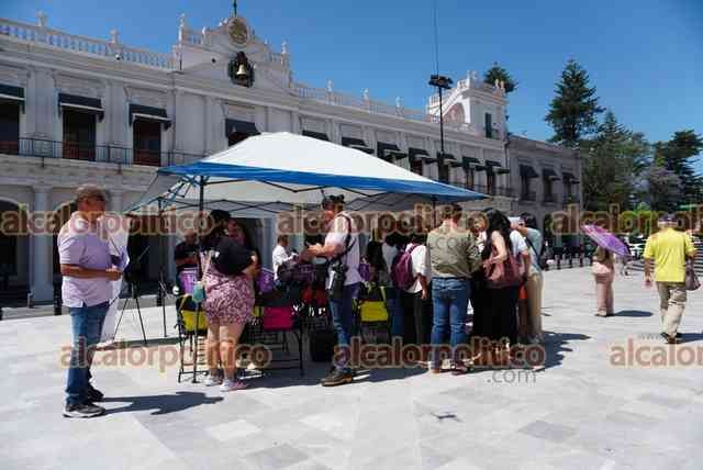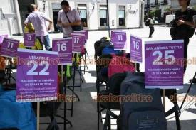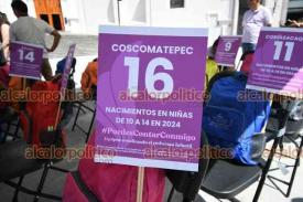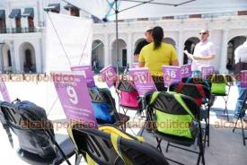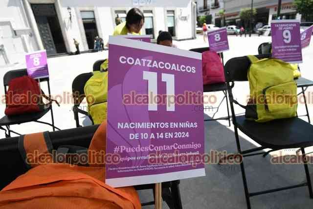 Xalapa, Ver., 28 de abril de 2026.- En la Plaza Lerdo, con sillas, mochilas y letreros con estadísticas municipales, activistas de Equifonía buscan concientizar acerca de la problemática de embarazos infantiles en el Estado.