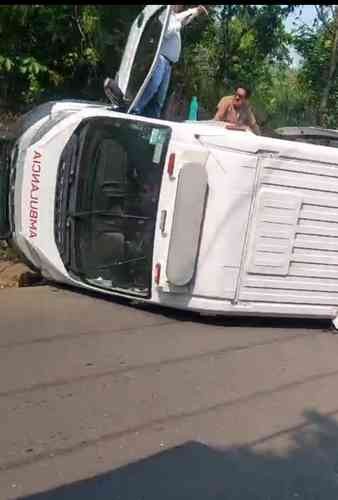 Misantla, Ver., 28 de abril de 2026.- Ambulancia de la Secretaría de Salud asignada al Hospital de Naolinco volcó en la carretera Xalapa-Misantla. Acudieron elementos de la Cruz Roja local y del grupo de Rescate Yecuatla para brindar atención y apoyo a los ocupantes de la unidad.