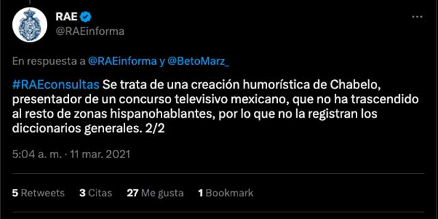 Twitter @RAEinforma, agrega “se trata de una creación humorística de Chabelo, presentador de un concurso televisivo mexicano, que no ha trascendido al resto de zonas hispanohablantes”.