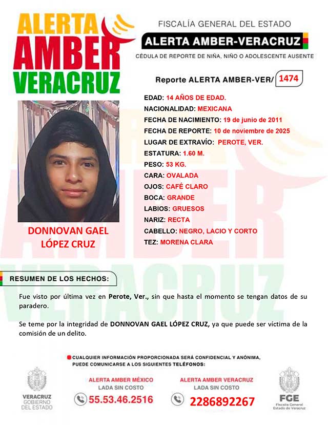 El programa Alerta Amber Veracruz, agradece su colaboración e informa la activación de la ALERTA AMBER- VERACRUZ 1474 por el adolescente Donnovan Gael López Cruz de 14 años de edad