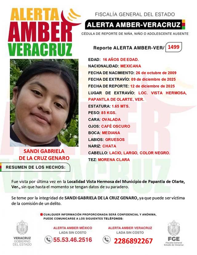 El programa Alerta Amber Veracruz, agradece su colaboración e informa la activación de la ALERTA AMBER- VERACRUZ 1499 por la adolescente Sandi Gabriela de la Cruz Genaro de 16 años de edad