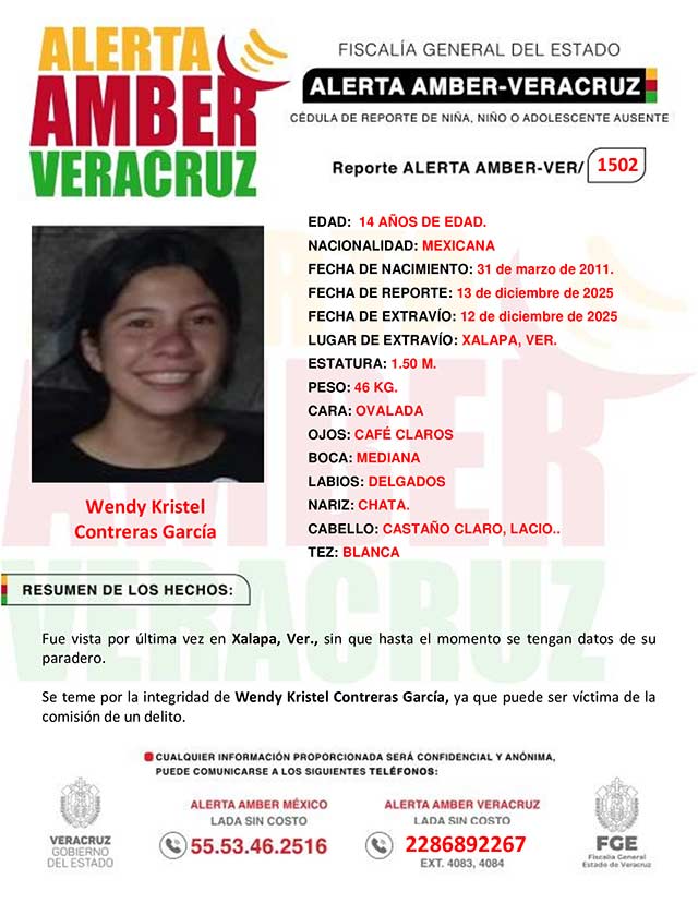 El programa Alerta Amber Veracruz, agradece su colaboración e informa la activación de la ALERTA AMBER- VERACRUZ 1502 por la adolescente Wendy Kristel Contreras Gracia de 14 años de edad