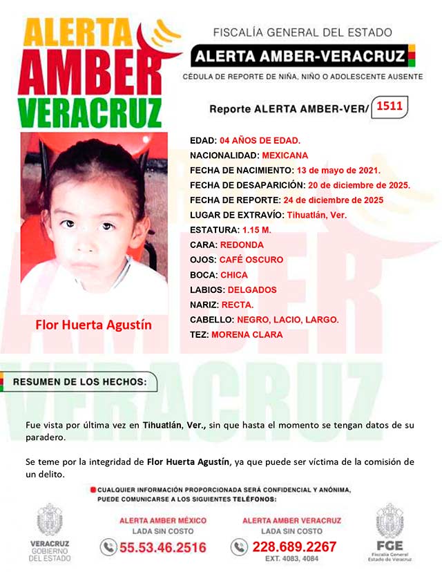 El programa Alerta Amber Veracruz, agradece su colaboración e informa la activación de la ALERTA AMBER- VERACRUZ 1511 por la niña Flor Huerta Agustín de 4 años de edad