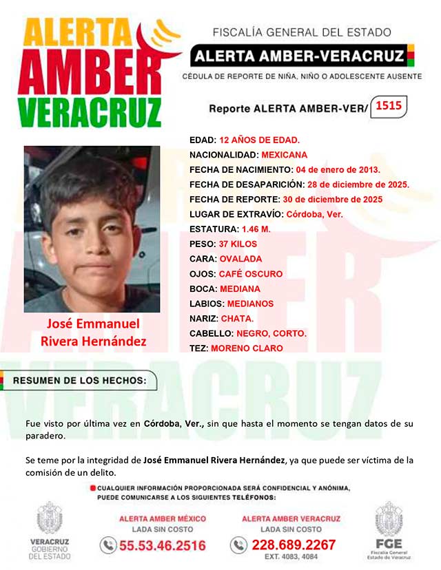 El programa Alerta Amber Veracruz, agradece su colaboración e informa la activación de la ALERTA AMBER- VERACRUZ 1515 por el niño José Emmanuel Rivera Hernández de 12 años de edad