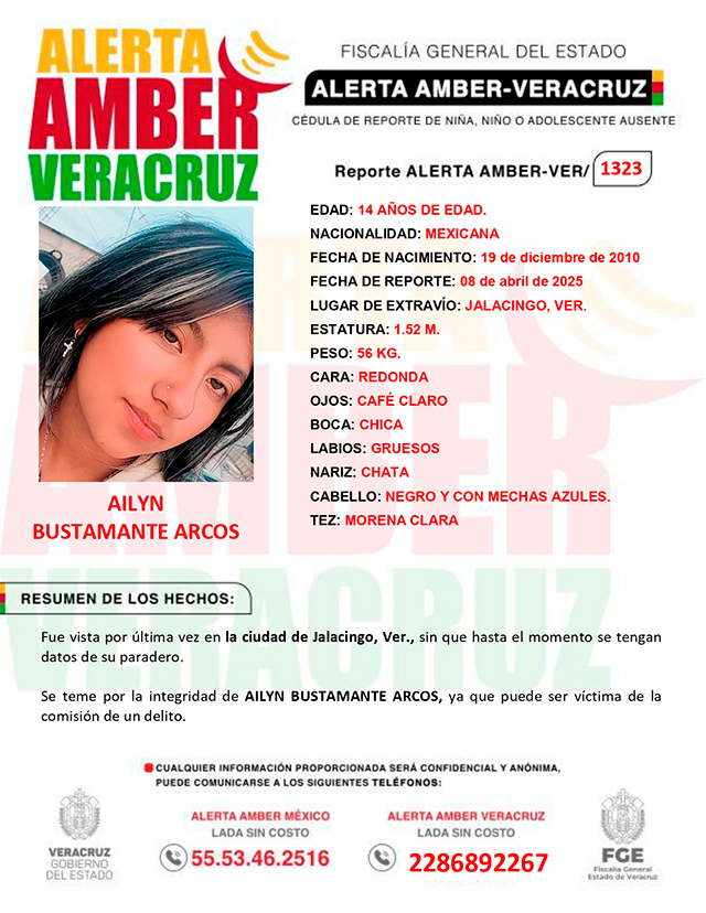 LAACTIVACIÓNde la ALERTA AMBER- VERACRUZ 1323 por la adolescente AILYN BUSTAMANTE ARCOS de 14