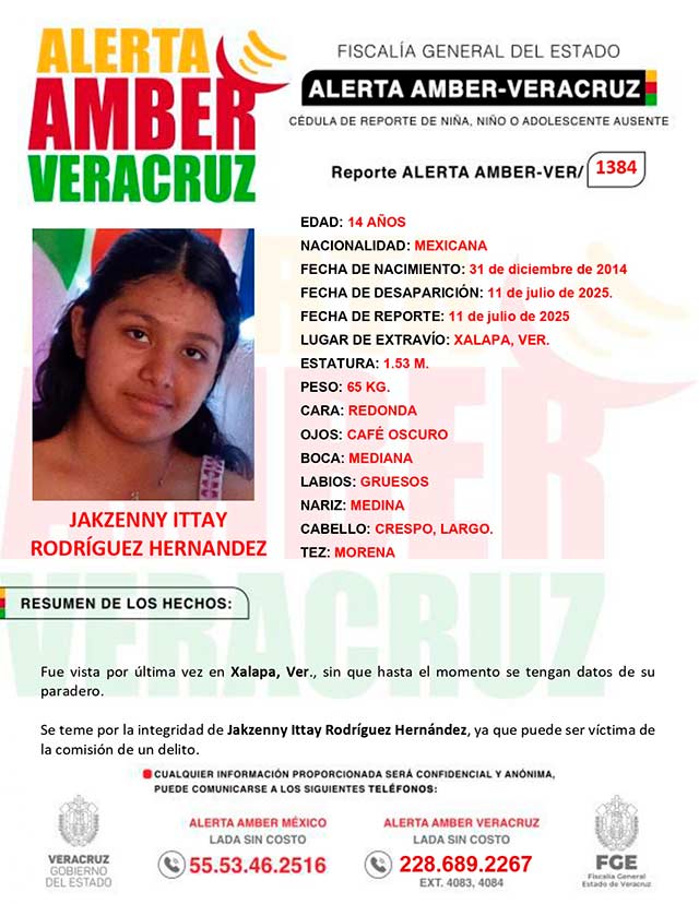 El programa Alerta Amber Veracruz, agradece su colaboración e informa la activación de la AAMBER- VERACRUZ 1384 por la adolescente Jakzenny Ittay Rodríguez Hernández, de 14 años de edad