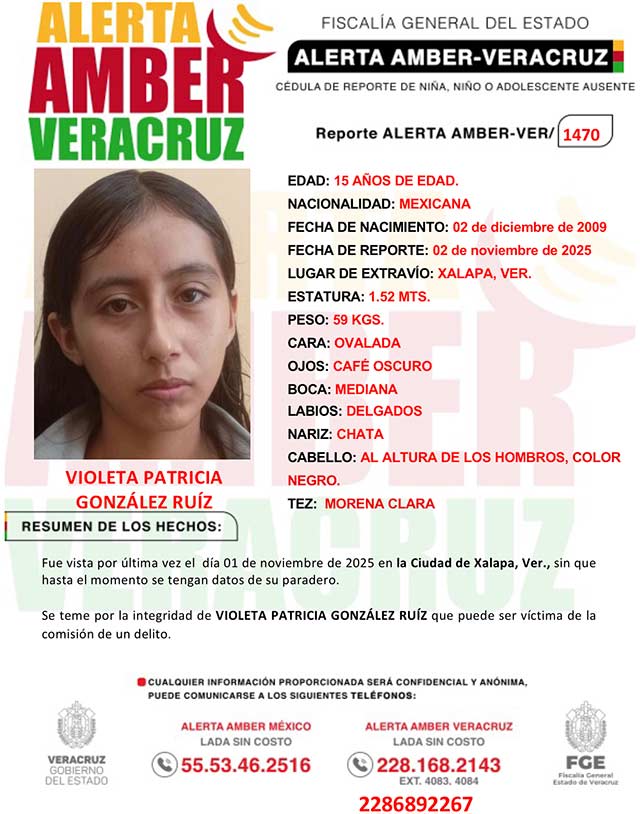 El programa Alerta Amber Veracruz, agradece su colaboración e informa la activación de la ALERTA AMBER- VERACRUZ 1470 por la adolescente Violeta Patricia González Ruiz de 15 años de edad y ALERTA AMBER- VERACRUZ 1471 por la adolescente Yenifer Bravo Martínez de 17 años de edad