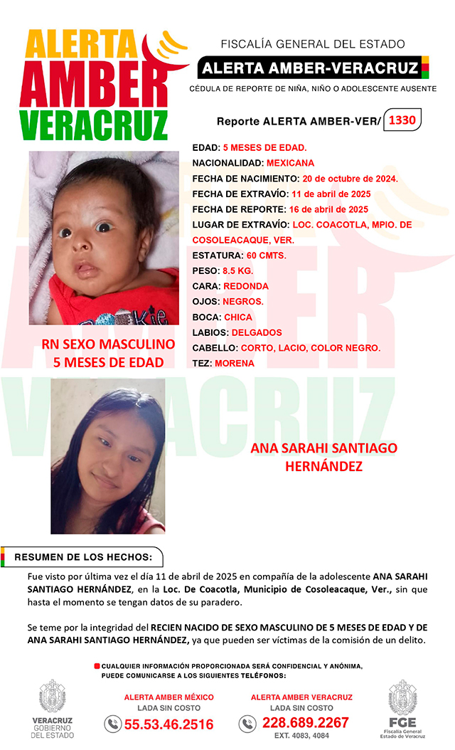 El programa Alerta Amber Veracruz, solicita su colaboración para la activación de la ALERTA AMBER- VERACRUZ 1330 por el RN de 5 meses de edad, sin registrar