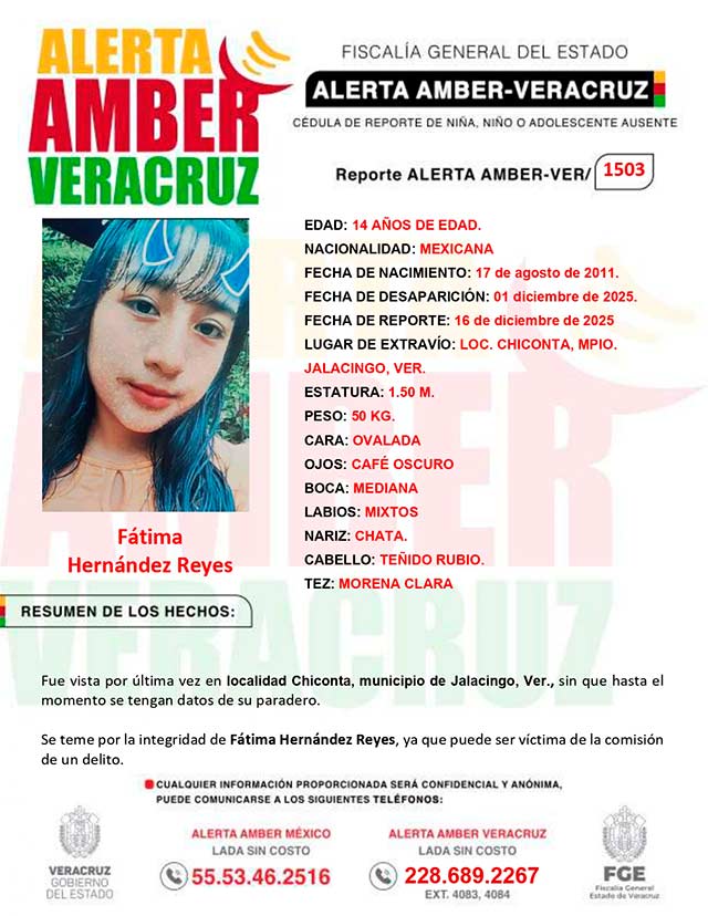 El programa Alerta Amber Veracruz, agradece su colaboración e informa la ACTIVACION de la ALERTA AMBER- VERACRUZ 1503 por la adolescente Fátima Hernández Reyes de 14 años de edad.