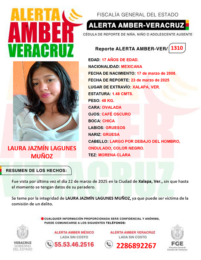 El programa Alerta Amber Veracruz, solicita su colaboración para la activación de la ALERTA AMBER- VERACRUZ 1310 por la adolescente Laura Jazmín Lagunes Muñoz de 17 años.