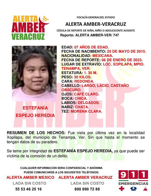 El programa Alerta Amber Veracruz, solicita su colaboración para la ACTIVACIÓN de la Alerta-Amber-747 por la niña de 07 años de edad.